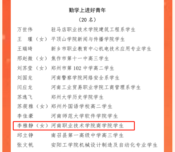 近日,由省委宣传部、团省委举办的2020年“新时代河南向上向善好青年”名单揭晓,我校李雅静同学获得2020年“新时代河南向上向善好青年——勤学上进好青年”荣誉称号。
