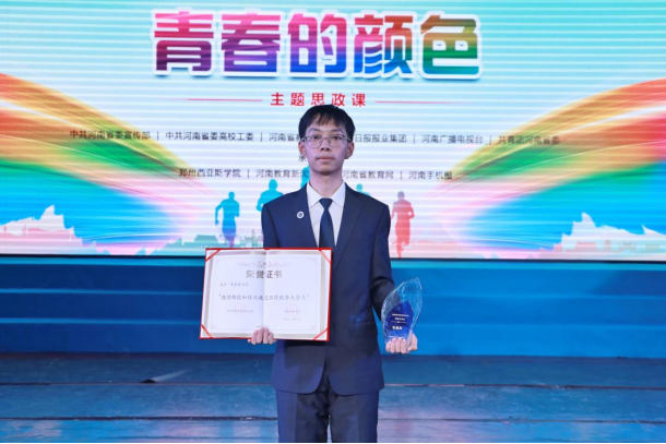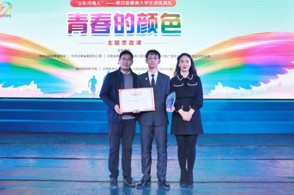 12月17日,由中共河南省委宣传部、中共河南省委高校工委、河南省教育厅、河南日报报业集团、河南广播电视台、共青团河南省委等六部门共同主办的“出彩河南人”第四届最美大学生颁奖典礼暨“青春的颜色”主题思政课在郑州西亚斯学院举行,近百万人线上线下同步收看了这堂思政大课。作为全省25名疫情防控和防汛救灾工作的优秀大学生之一,我校数字创意与设计学院学生李晨泽登台领奖!