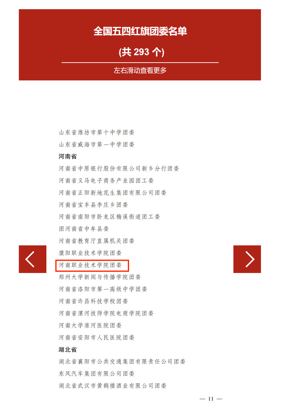 学校先后获得“河南省五四红旗团委”、全国高校“活力团支部”、全省高校思想政治工作优秀品牌、全省高校思想政治工作精品项目、河南省高校校园文化建设优秀成果奖、“活力杯”河南学校共青团基层基础工作大赛优秀组织奖等荣誉。其中,“河职宿舍小书架”成功入选中国高等职业教育质量年度典型案例。在第十一届全国少数民族运动会筹备工作中,我校获省委、省政府集体嘉奖;在“挑战杯”中国大学生创业计划竞赛中,我校荣获国赛金奖;在“挑战杯”大学生课外学术科技作品竞赛中,我校荣获国赛三等奖,两个奖项均实现河南省高职院校在该赛项中零的突破,交出了一份让党放心、让青年满意的青春答卷。