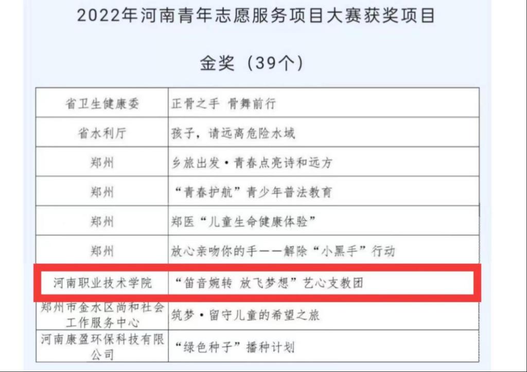 9月14日至15日,“喜迎二十大 志愿新时代”——第六届中国青年志愿服务项目大赛河南赛区选拔赛暨2022年河南青年志愿服务项目大赛省赛决赛在郑州举办,我校“笛音婉转 放飞梦想”艺心支教团荣获省赛金奖,并成功晋级国赛。