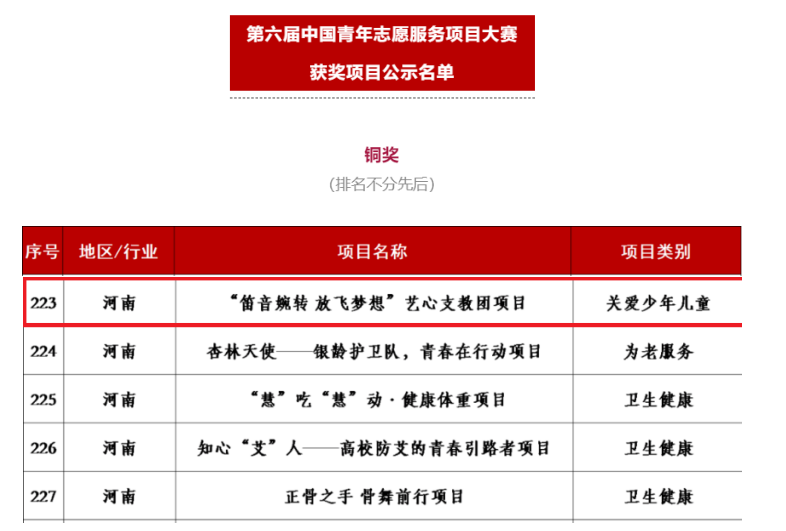 近日,由共青团中央、中央文明办等部委共同举办的第六届中国青年志愿服务项目大赛全国赛终评落下帷幕,我校“笛音婉转·放飞梦想”艺心支教团项目荣获国赛铜奖,这是我校首次在此类比赛中获得国家级奖项,创造了我校在该项赛事中的最好成绩,实现了历史性突破。
