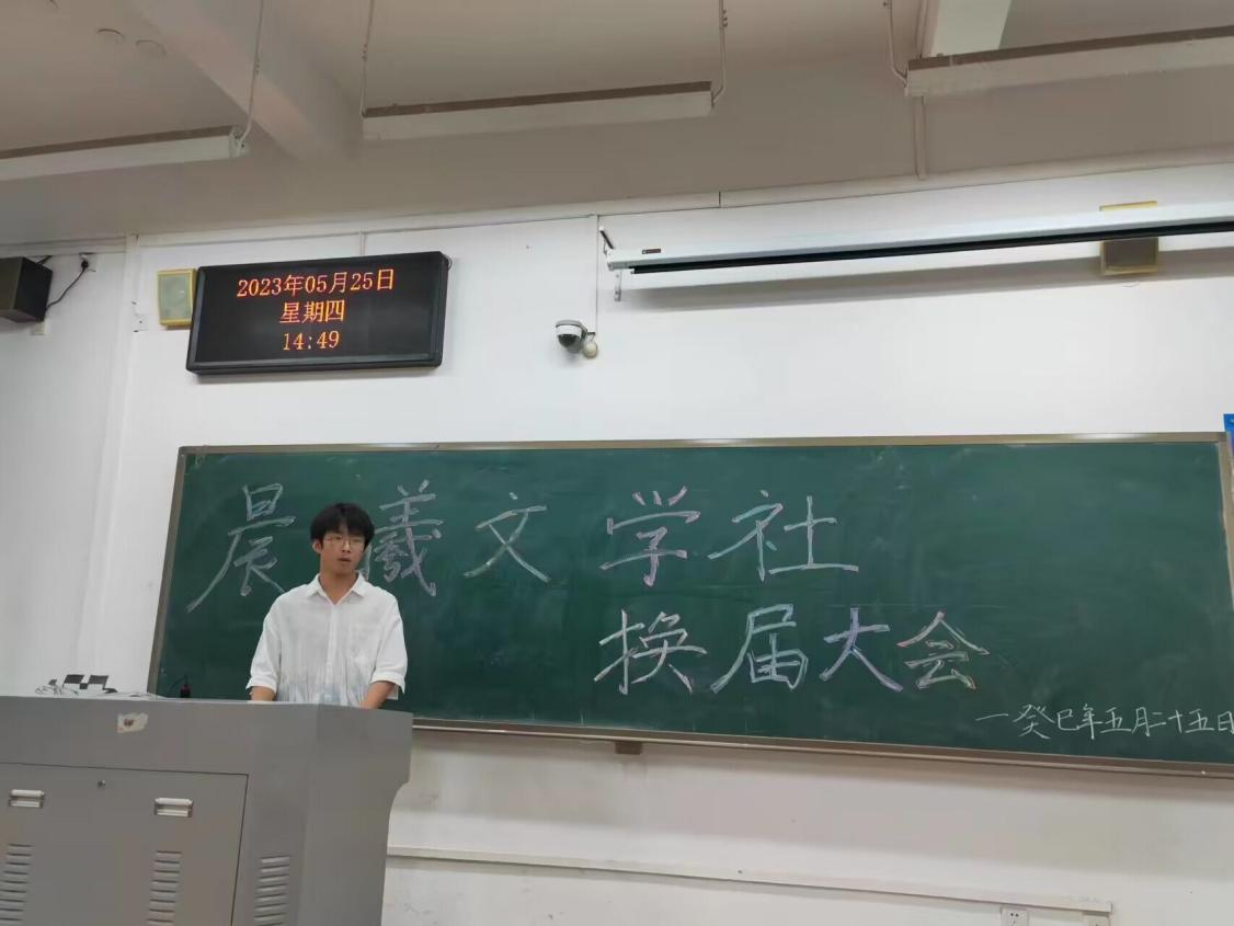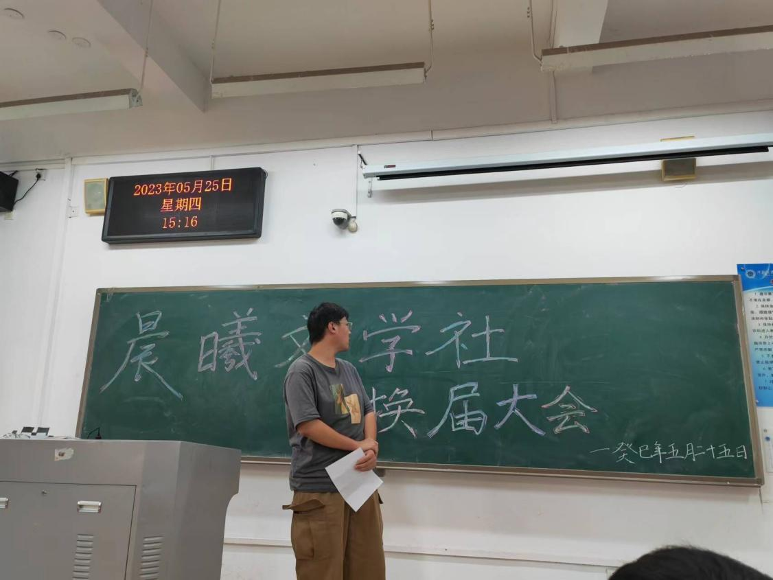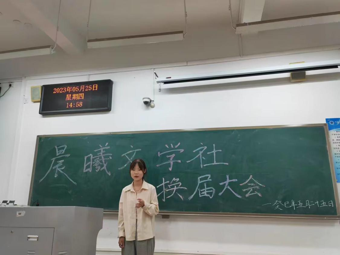 为选举出新一届晨曦文学社负责人,5月25号下午,晨曦文学社在1号教学楼1202教室,组织开展晨曦文学社换届大会。文学社全体成员参加了会议。会议由文学社社长赵影影主持。