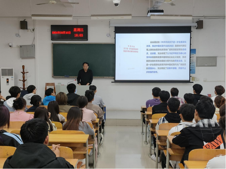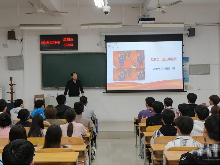 为深入学习贯彻党的二十届三中全会精神,用党的创新理论引领青年学生思想,引导大学生深入理解和把握全会的精神和要义,10月16日,我校团委组织全校学生干部开展了以“进一步全面深化改革,开辟中国式现代化广阔前景,深入学习贯彻党的二十届三中全会精神”为主题的宣讲活动,由学校党的二十届三中全会精神宣讲活动三级宣讲组组长党政办副主任曾凤括老师作主讲,92名校级学生组织骨干参加。