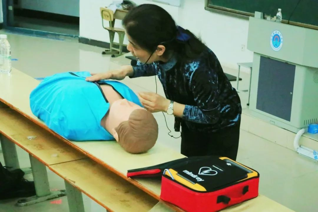 本次培训以“为生命护航”为主题,特邀中国红十字会应急救护培训师丁利娟老师进行授课。培训过程中,丁利娟老师就突发性晕厥、扭伤、骨折、皮肤擦伤、出血、气道异物梗阻、中毒、烧伤、踩踏等危险情况的急救措施进行了详细讲解。讲解过程中,丁利娟老师邀请同学们到台前进行模拟人实践,包括心肺复苏的标准姿势、AED的正确使用等,并现场演示了“8字包扎”、“单侧胸部包扎”的正确手法。