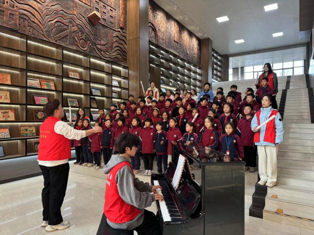 学生志愿者通过“歌词接龙”“手势教学”等趣味方式,带领二年级(6)班的小朋友们学唱经典红歌《学习雷锋好榜样》,并结合歌词讲述雷锋助人为乐的故事。孩子们踊跃分享自己帮助同学的暖心经历,操场上洋溢着温暖与感动。