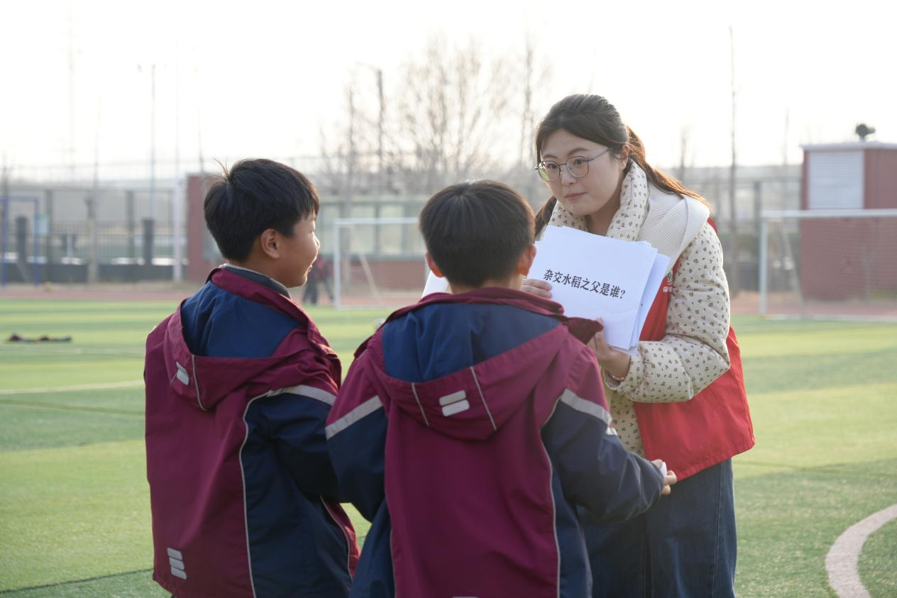 操场上的“雷锋知识接力赛”将活动推向高潮。由大学生与小学生组成的4支混合队伍展开角逐,每组需完成15米折返跑后抢答雷锋知识题。孩子们在奔跑中既锻炼体魄又增长知识,最终“先锋小队”以全胜战绩夺冠。
