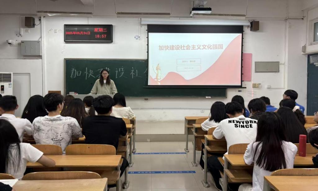 为深入学习贯彻习近平新时代中国特色社会主义思想,推动校园文化建设,6月24日,我校党的创新理论“笃行”学生宣讲团成员潘乐彤面向学生会全体学生干部,开展了一场以“加快建设社会主义文化强国”为主题的宣讲活动。