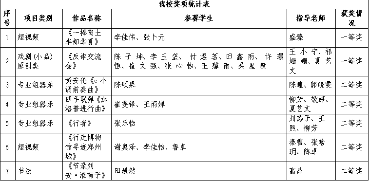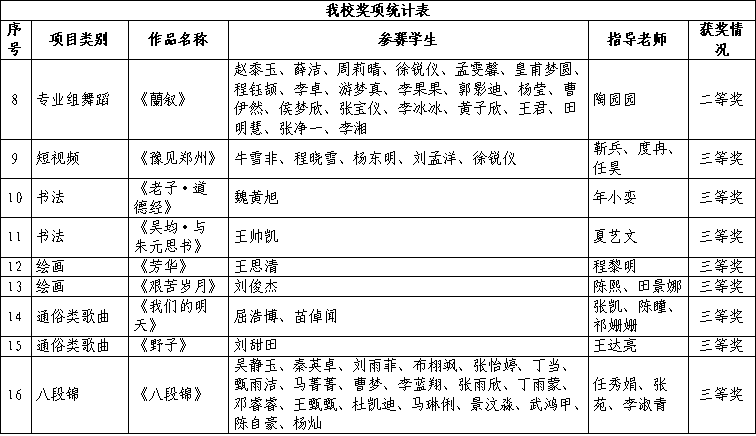 在本届活动中,我校学子表现亮眼,获奖成果涵盖多个赛事类别:在河南省大学生书法绘画和短视频创作比赛中获一等奖1项、二等奖2项、三等奖5项;在河南省大学生戏剧(小品)比赛中获一等奖1项;在河南省大学生器乐比赛中获二等奖3项;在河南省大学生歌手比赛中获三等奖2项;在河南省大学生舞蹈比赛中获二等奖1项;在河南省大学生八段锦比赛中获三等奖1项。