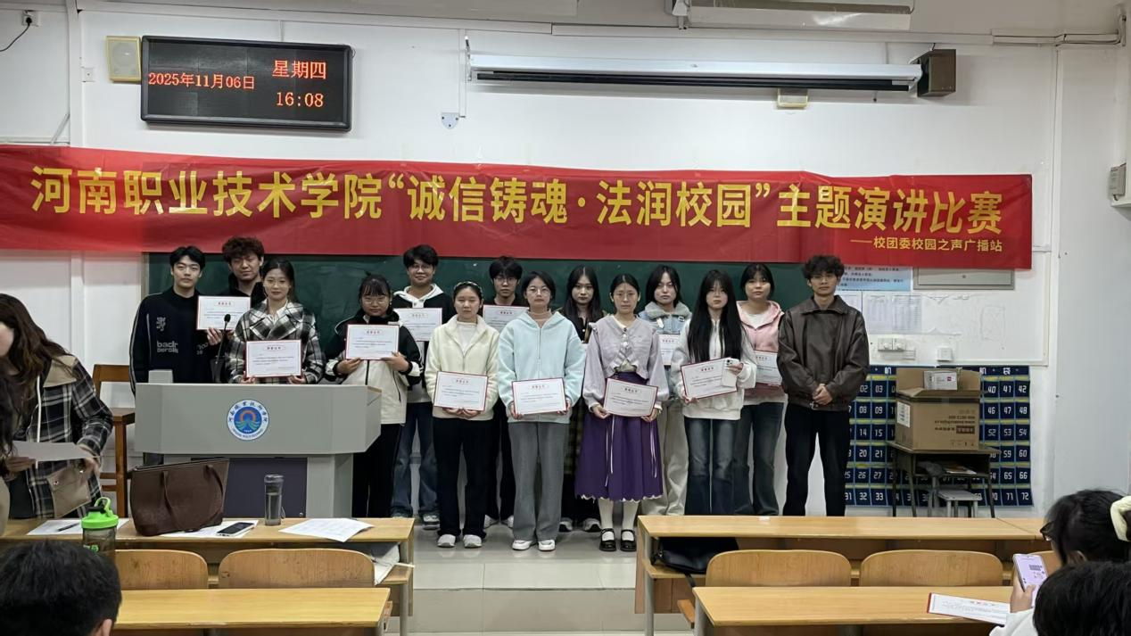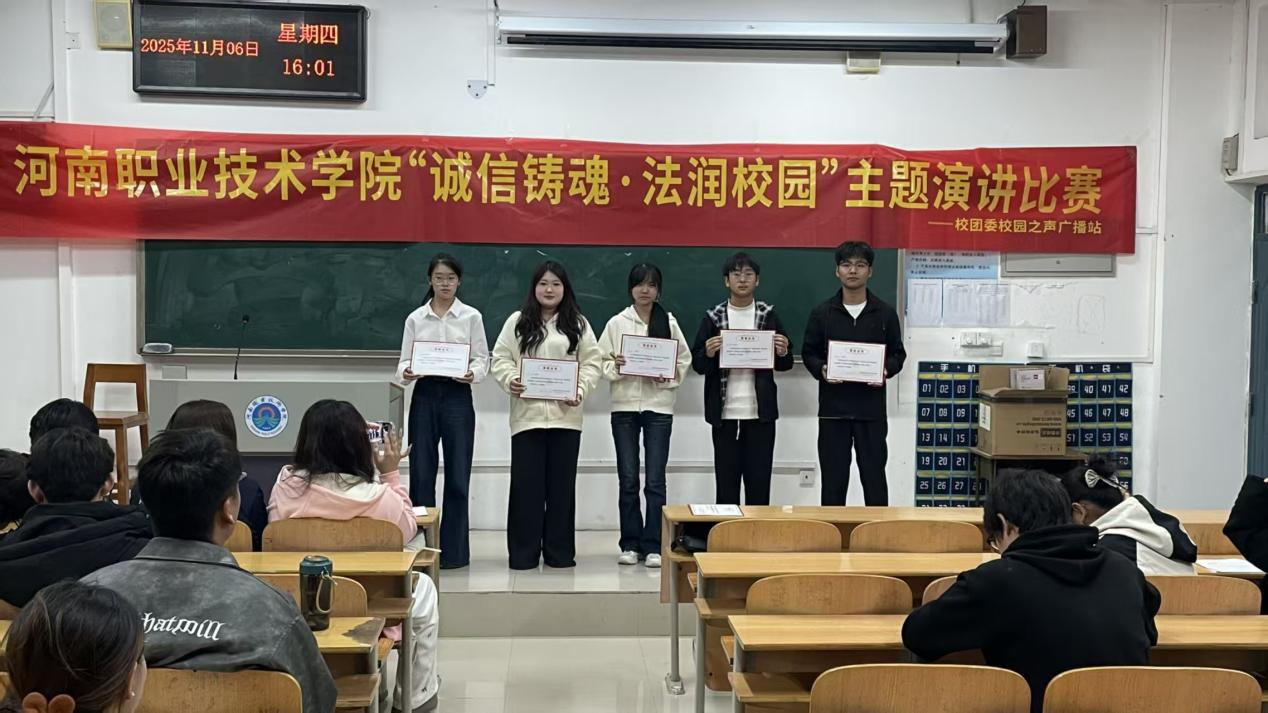 为厚植诚信文化、涵养法治精神,引导青年学子将诚信与法治内化为精神追求、外化为自觉行动,11月6日下午,由校园之声广播站主办的“诚信铸魂·法润校园”主题演讲比赛在1202教室顺利举行。